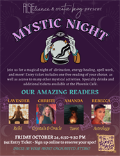 An evening of mysticism, connection, and soulful discovery Step into an enchanted night of candlelight, intuition, and community. Mystic Night invites you to explore a marketplace of mystical experiences—intuitive readings, spell-crafting, and self-guided rituals- while enjoying seasonal mocktails and treats from the Phoenix Café. Your ticket includes: One 15-minute session with the intuitive reader of your choice (tarot, astrology, Reiki, or crystals/oracle) Access to self-guided stations: spell jar creation, wishing well, aromatherapy samples, and a Major Arcana scavenger hunt following Ember the Phoenix’s story The chance to add additional readings onsite for $20 each Come dressed in your best “Dark Mystique” attire and immerse yourself in an evening of magic, reflection, and connection. Date: Friday, October 24 Time: 7:00–9:30 PM Cost: $45 per person