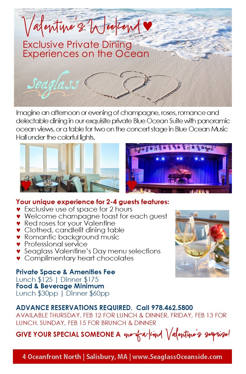 Imagine an afternoon or evening of champagne, roses, romance and delectable dining in our exquisite private Blue Ocean Suite with panoramic ocean views, or a table for two on the concert stage in Blue Ocean Music Hall under the colorful lights. Advanced reservations required.